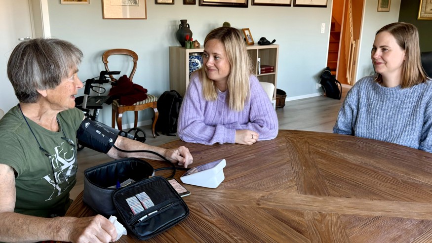 Kirsten Tveter er veldig fornøyd med å ha digital hjemmeoppfølging. Her snakker hun med kommunens sykepleiere Marie Støles og Hanne Heyer, som følger med på resultatene fra målingene Tveter sender inn.