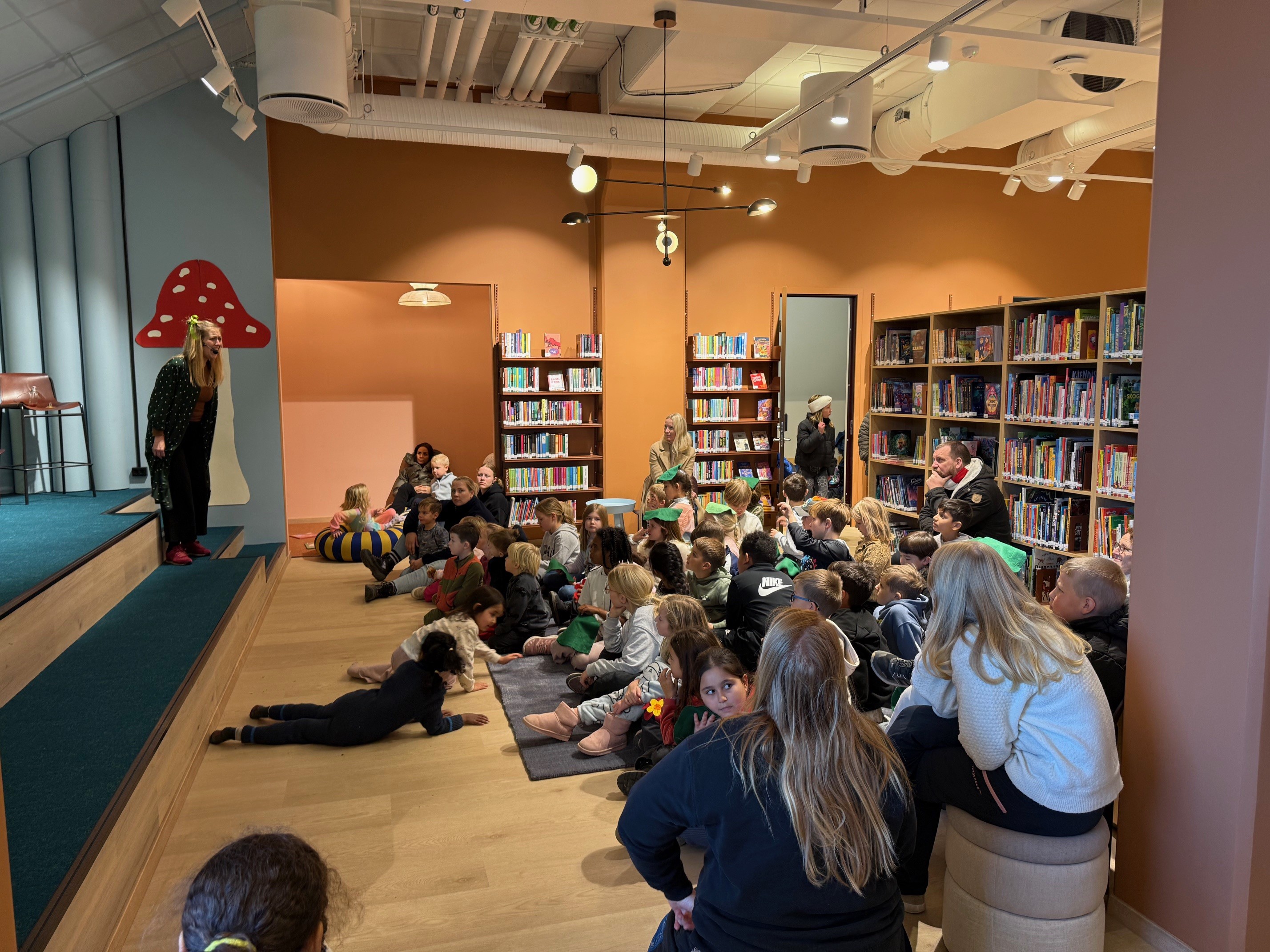 Innendørs fikk de besøkende se lyse, moderne lokaler med friske farger. Her er det en egen stille sone for arbeid og studier, og en liten scene for arrangementer og kulturelle innslag. Med universell utforming, fleksible møteplasser og flere aktivitetsmuligheter får både barn, unge og voksne et sted hvor de kan lese, lære, og samles i trygge omgivelser.