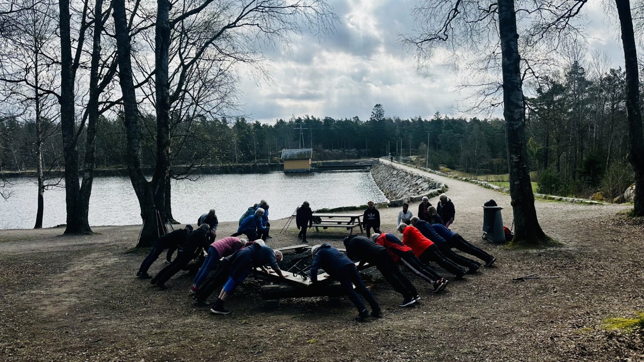 - Styrkeøvelser med bruk av egen kroppsvekt, strikker og omgivelsene (eks: reise/sette seg fra benk, push ups, skulderpress med strikk).