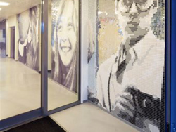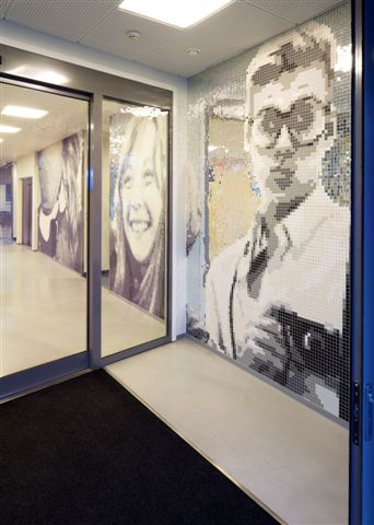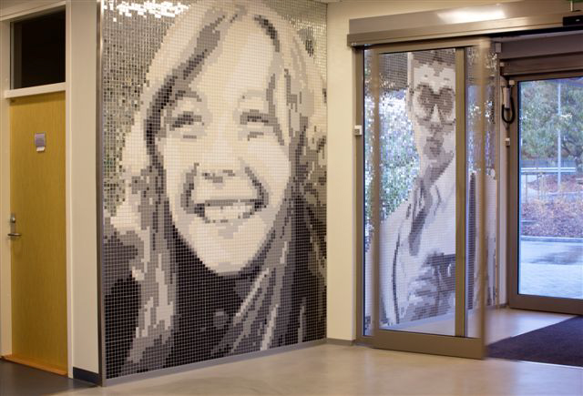 både i form og uttrykk. Bilder med gjenkjennelighet og nærhet og som kan stimulere til samtaler. Bildene er trykket på aluminiumsplater og limt rett på veggene i korridorene.