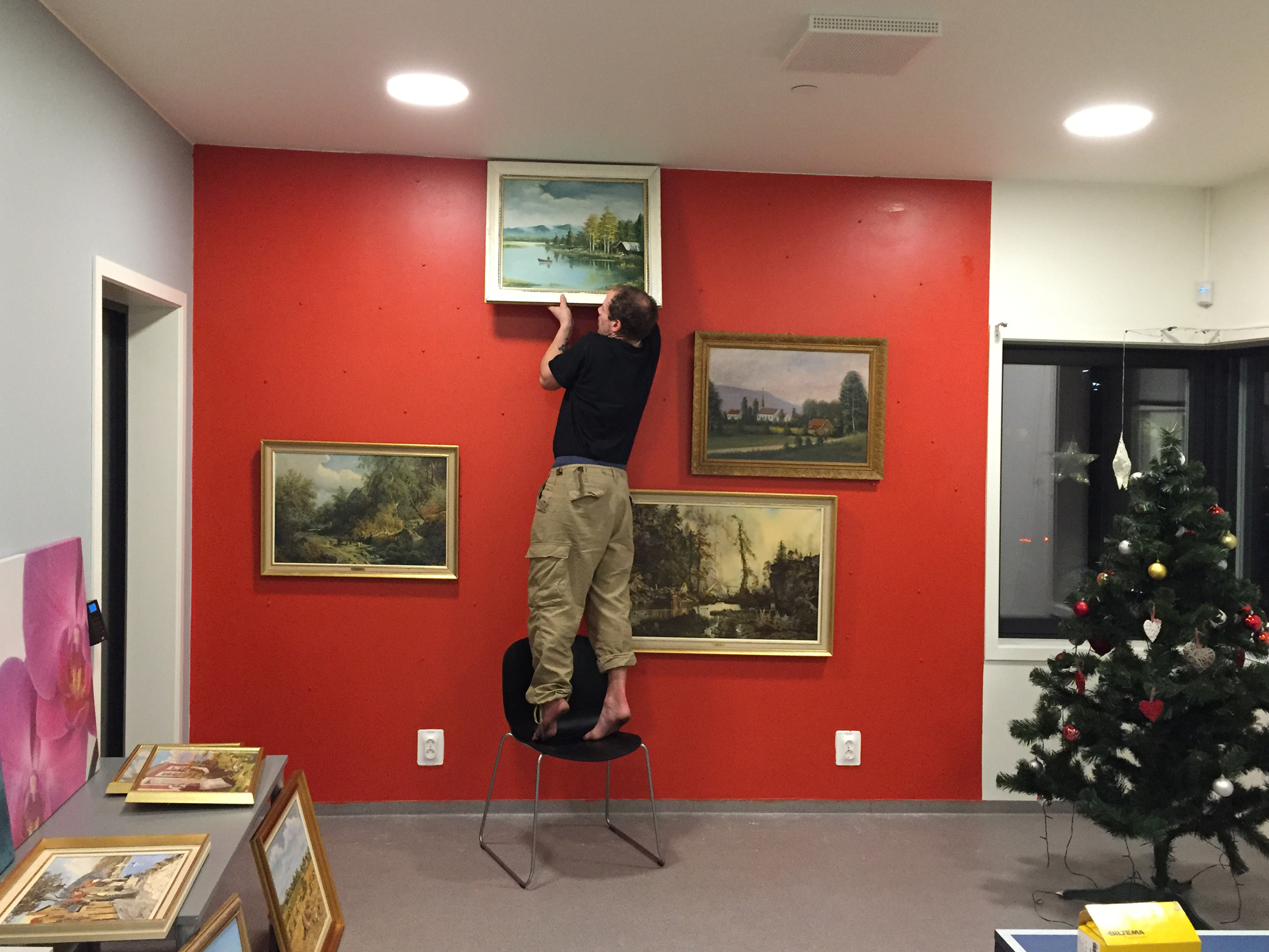Traraveien 19 er et lavterskel botilbud for rusavhengige. Her har kunstner Svein Ove Kirkhorn satt opp sitt verk på mørk vegg. Maleriene på den røde veggen kan beboerne låne med seg inn til sine private rom. Et lokalt artotek!