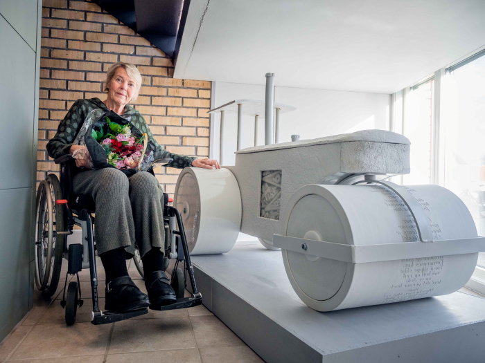 Tittel: Dampveivals Født 14. mars 1950, Kristiansand Fredrikstad kommune ble overrakt kunstverket «Dampveivals» fredag 11. november 2022. Kunstverket er laget i forbindelse med Østfold Kunstnersenter sitt 20-års jubileum i 2021, og er en gave til kommunen. Det er plassert hos Teknisk drift i Tomteveien. Da Østfold kunstnersenter fylte 10 år i 2001 bestemte en gruppe av Fredrikstads kunstnere seg for å lage et felles prosjekt i hagen utenfor Fergestedsveien 5. Kunstnerne laget hvert sitt tresnitt på store MDF plater, la på papir og lot en virkelig dampveivals kjøre over platene og trykke det lange bildet på noen titalls meter. Da kunstnersenterets 20 års jubileum stod for tur hadde Tulla Elieson flyttet sitt keramikkverksted fra Vaterland til NTP. Her hadde hun i flere år blitt eksponert for fabrikkens industriprodukter, og lett gjennom fabrikkens gamle lagre og funnet rester etter fabrikkens tidligere produksjon. Her fant hun blant annet bokstaver og tall for hus og blokker, deler til sikringsskap, armatur, isolatorer i alle slags størrelser og utallige andre små produktene som hadde vært produsert en gang. Viktigst i dag er imidlertid «tønnene», eller de store runde sylinderne som er brukt i «dampveivalsen». Ideen om å lage nettopp en dampveivals kom av kunstsenterets nye jubileum, inspirert av fellesprosjektet ti år tidligere. Dampveivalsen skulle kunne trykke en tekst, så motoren er fylt med bokstaver.